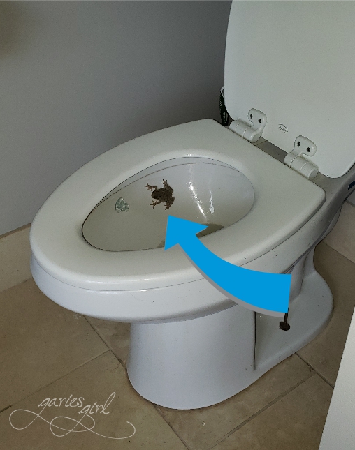 As we were preparing to go in (plastic container and an old toothbrush in hand) the frog started to lose his grip and slipped slowly down the side of the bowl and into the water (the just used toilet water). Now we were not only freaking out but slightly grossed out as well. We poked around with the toothbrush and the plastic container and instead of getting in, the frog swam away, and into one of the water inlets at the front of the toilet!