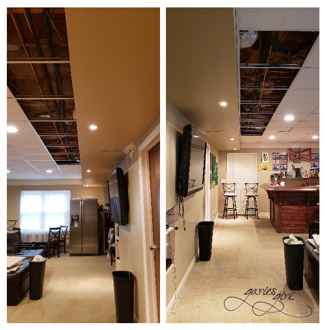 We have wood floors in our kitchen and I immediately grabbed towels to soak up the water in front of the fridge. I don’t know a lot, but I know water is not great for wood floors. I was so focused on the kitchen and my wood floors, that it didn’t even occur to me to check the basement for flood damage until later that day. I rushed downstairs to find a whole row of soaked and discolored ceiling tiles and two areas of soaking wet carpet. It looked bad, but also not too bad. None of the wet areas was over any of the furniture or dripping on any of our electronics.
