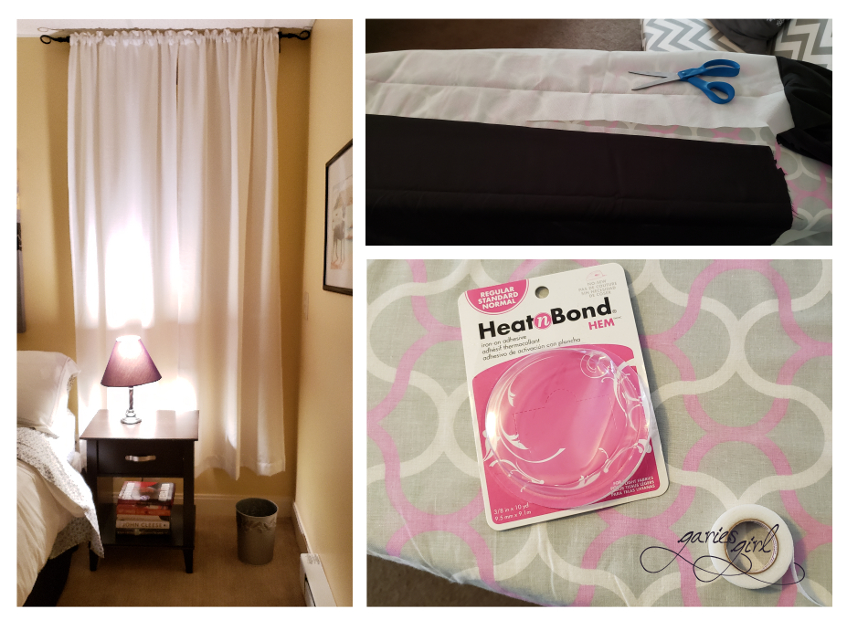 I cut two pieces and I used “no sew” iron on tape to attach them to the curtains. I bought black clips to blend with the curtain rod and fastened them to the top of the curtains. Another quick and easy fix and I spent less than $18!