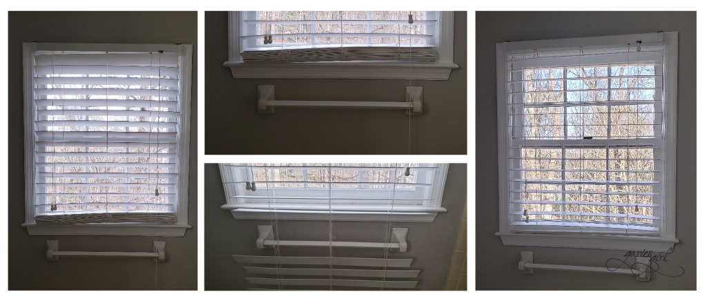 The house we currently live in had blinds in place for all the upstairs windows, except this bathroom window. I did a light bathroom refresh after we moved in. I painted the cabinet, the walls, installed a shelf above the toilet and added new hand towel hooks. I also added blinds to this window. I knew they were too long and that I needed to come back and shorten them at some point.
