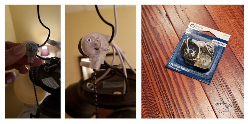 We have a very basic ceiling fan in our guest bedroom. This fixture also included lighting and once the fan was switched on at the wall switch, you could use the pulls to adjust the fan speed or to switch the lights on and off. Now one if the pulls were broken. I started by opening up the cover under the light and examining the mechanism. When I compared the one for the lights to the one for the fan, I realized that my mechanism was broken and needed to be replaced. Onto the shopping list it went.