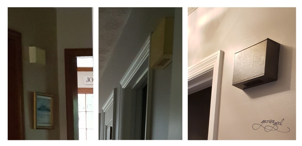 While I had the chime cover in my hand, I realized it was still cream colored and doesn’t fit with the new paint color on the walls. Two coats of grey spray paint and it too blended in a bit better.