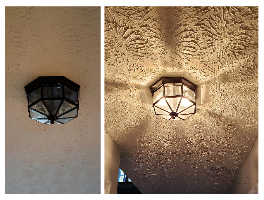 After a couple of days, I removed the tape and cleaned up my overspray and re-installed the light fixture again. A quick and easy fix for what was certainly an eyesore in our hallway.