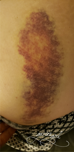 Thankfully, I didn’t use my hands to try and break my fall – would have broken a wrist for sure. But my butt (see what I did there?) was immediately complaining something awful and I knew this “misstep” was going to leave a mark. I wasn’t wrong. By that evening I started to turn purple and blue and sitting down was very painful. And I, ever the optimist that I am, kept pointing out to everyone that would listen that at least I didn’t drop or break any of the drawers!