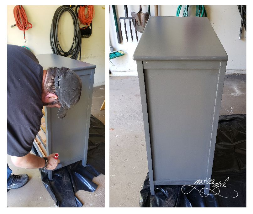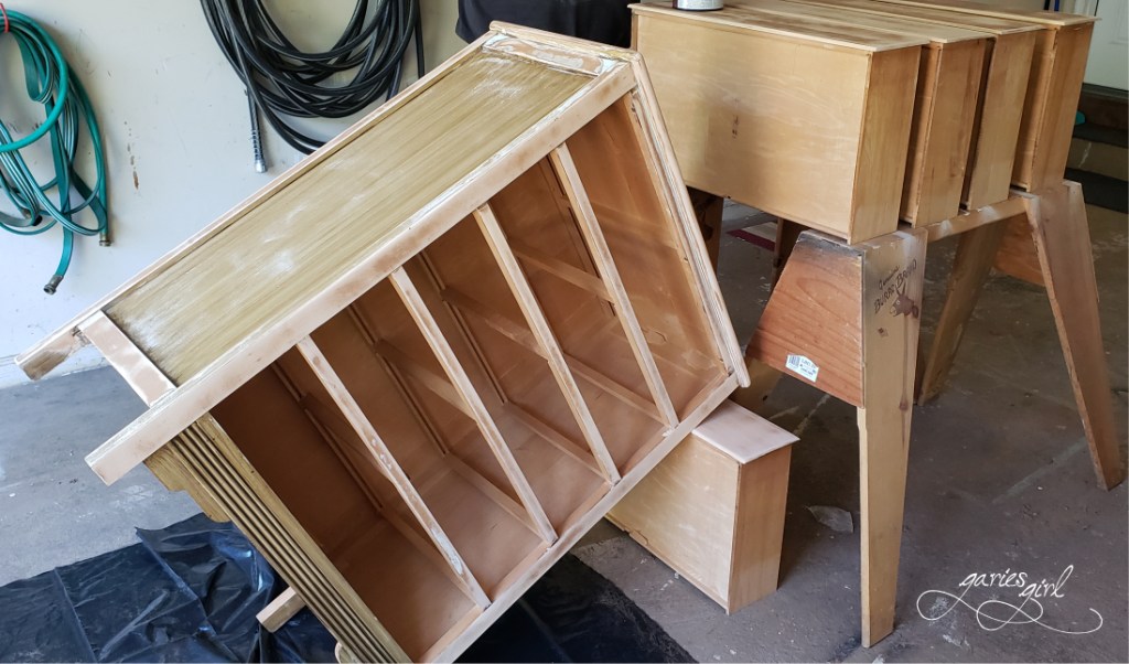 The sanding process is dirty, dusty work and best done outside or where you can clean up easily. Trying to attempt this in the area where you sleep or where you keep your clothes, is just not a good idea. So we removed all the clothes from the drawers, the drawers from the dresser and prepped a spot in the garage for the project.