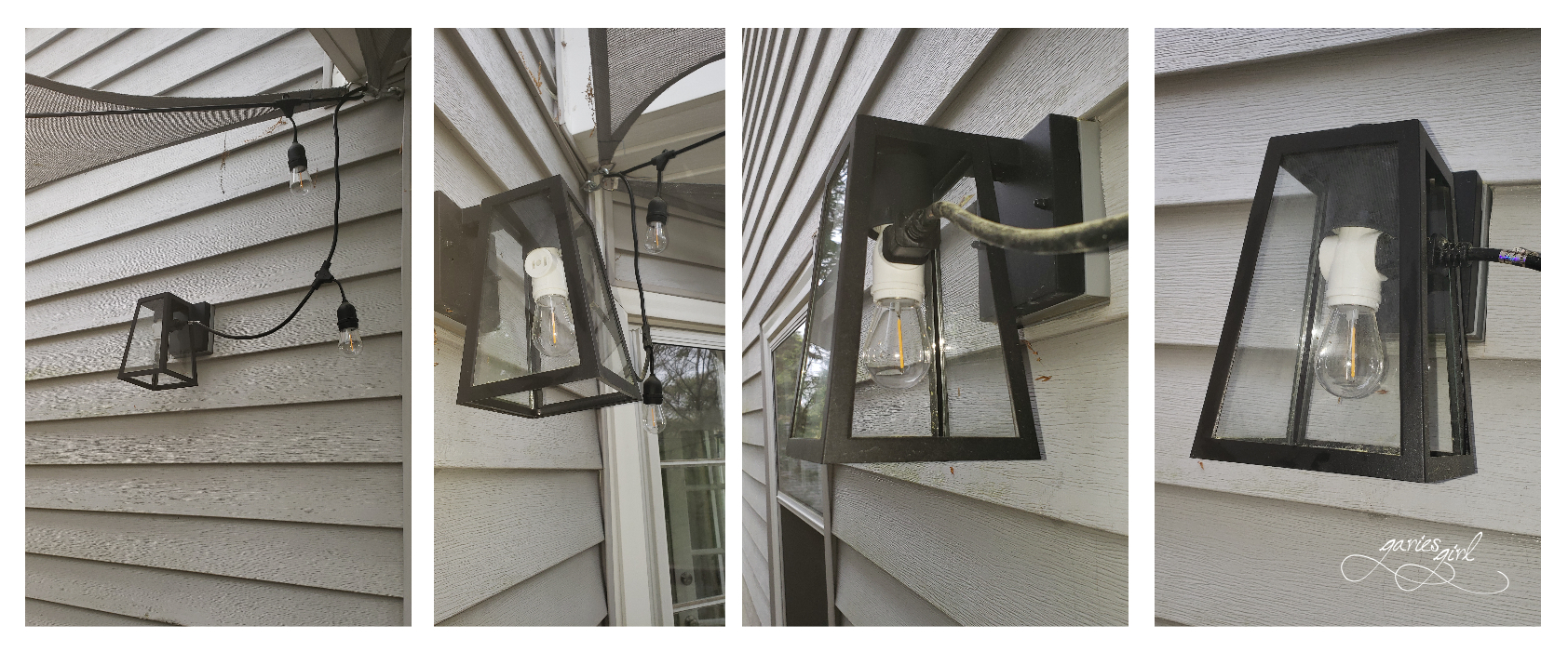 Since our LED lights weren’t the solar version (yes, you can buy those) we also had to plan on where to get power for our lights. Our outside outlet was right by our backdoor and would have been a natural starting point for our string lights. But I was worried that when the lights were not plugged in (and on) they would be dangling right in our “foot traffic” path. And I didn’t like that there would be a string of lights starting at the outlet and running up the wall. A bit more research got us the best solution ever – I’ll call it our *** Secret Item *** for now. More on that later 😉