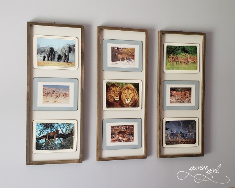 While playing with the layout again, I quickly realized three frames would not only look better, but will be lighter and easier to hang on the wall. I also realized that I didn’t necessarily need glass in these frames. If I picked the right frame, I can just display them on the backing.