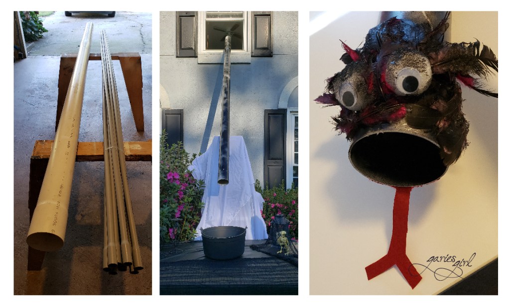 The candy chute was a lot of fun to make. I used a large PVC pipe from Lowes and gave it a light coat of black spray paint. I decorated one end with some hot glue, and black spray-painted feathers and created a tongue with red felt and eyes from foam balls. It will rest on a ladder covered in white sheets, that we will have up behind our candy table.
