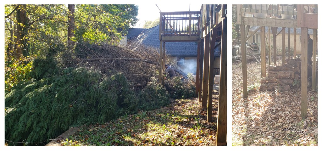 Two trees came down in our back yard early November, narrowly missing our house and just hitting the far corner of our deck bump out. After the huge cleanup effort, we were left with a bunch of tree stumps. Actually, we decided to keep the stumps. Since we now have two firepits (one in front of the house and one on the downstairs patio) they will come in handy once they are completely dry. In six months’ time, if I understand correctly. All of this wood had to go somewhere and preferably be out of sight. Under the deck made the most sense for just that very reason. And also, since I was the one stacking the stumps, not too far to carry from where they were cut.