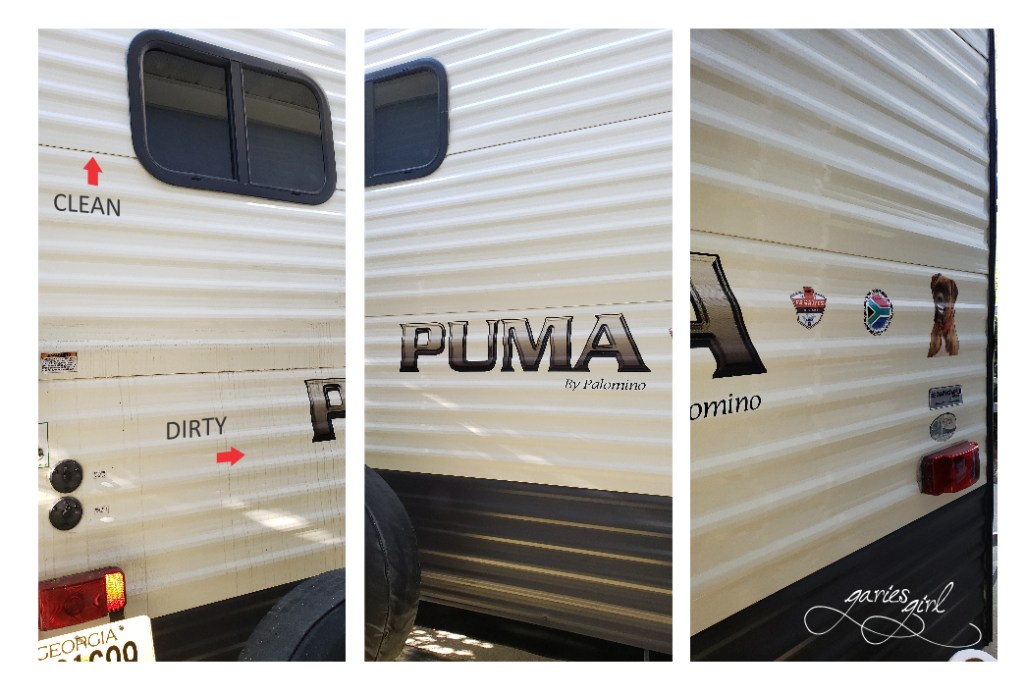 So Pieter and I decided to have a little fun with this project, use all three products and compare the results. Our RV was pretty dirty, with black streaks everywhere down the sides. We picked the dirtiest side and tried all three cleaning solutions. To keep it fair, we used the same cleaning pads, and the same amount of pressure with all three products. Pieter even agreed to be on camera for our first RV video about this whole process. Here is a link to the full video on YouTube: https://youtu.be/FmxSIV3LCoI