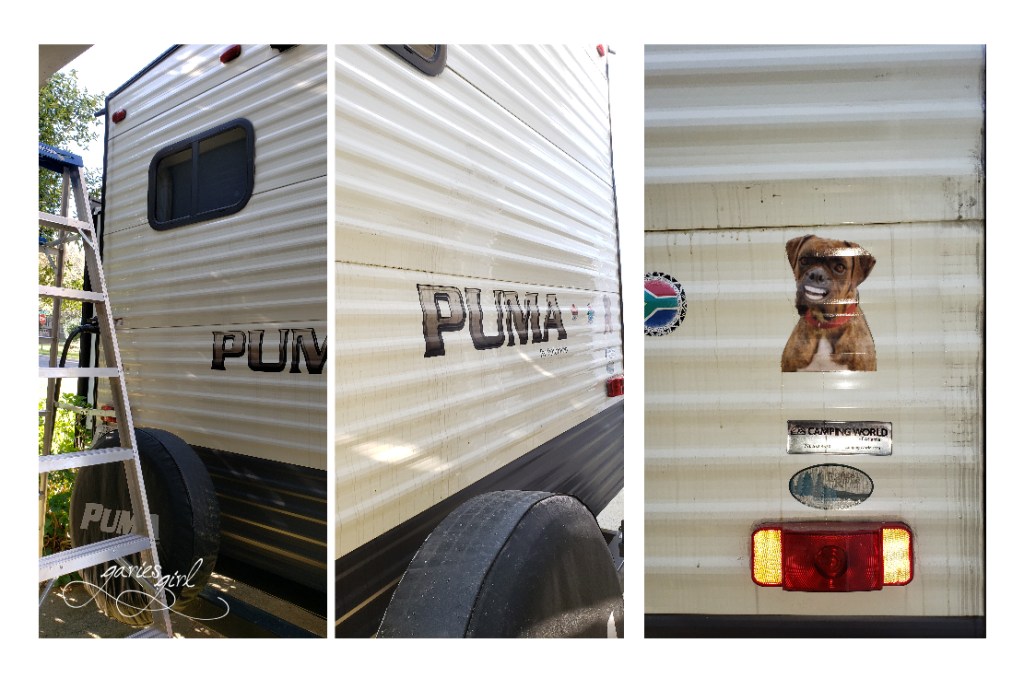 We have a 36 foot travel trailer (can sleep 10, so quite large) and in total, it took me 7 hours to clean most of it. The biggest bulk of my time was spent one Saturday when Pieter was at work. I had my music playing and was enjoying time outside, away from my desk. I did as much as I could on that Saturday, but didn’t make it to the 100% mark. Pieter got back into it on Sunday and was able to do the last section on the right side and the front part of the RV.