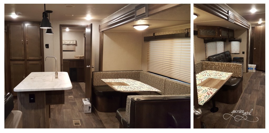You enter the RV right into the main area. On your left is the kitchen, straight ahead is a U-shaped dinette and a separate couch. The kids’ room is all the way to the left, with the single bathroom and main bedroom to the right of the door.