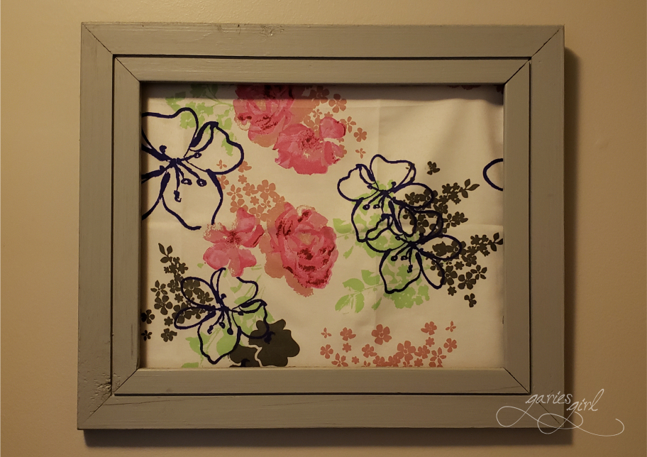 You might not have thought about it before, but fabric can also be framed as art. I had a thrift store frame that I wanted to use in my laundry room. I painted the frame grey and simply stapled a piece of leftover fabric to the back of the frame. Last thing to do – is hang it on the wall. Can it be any easier?