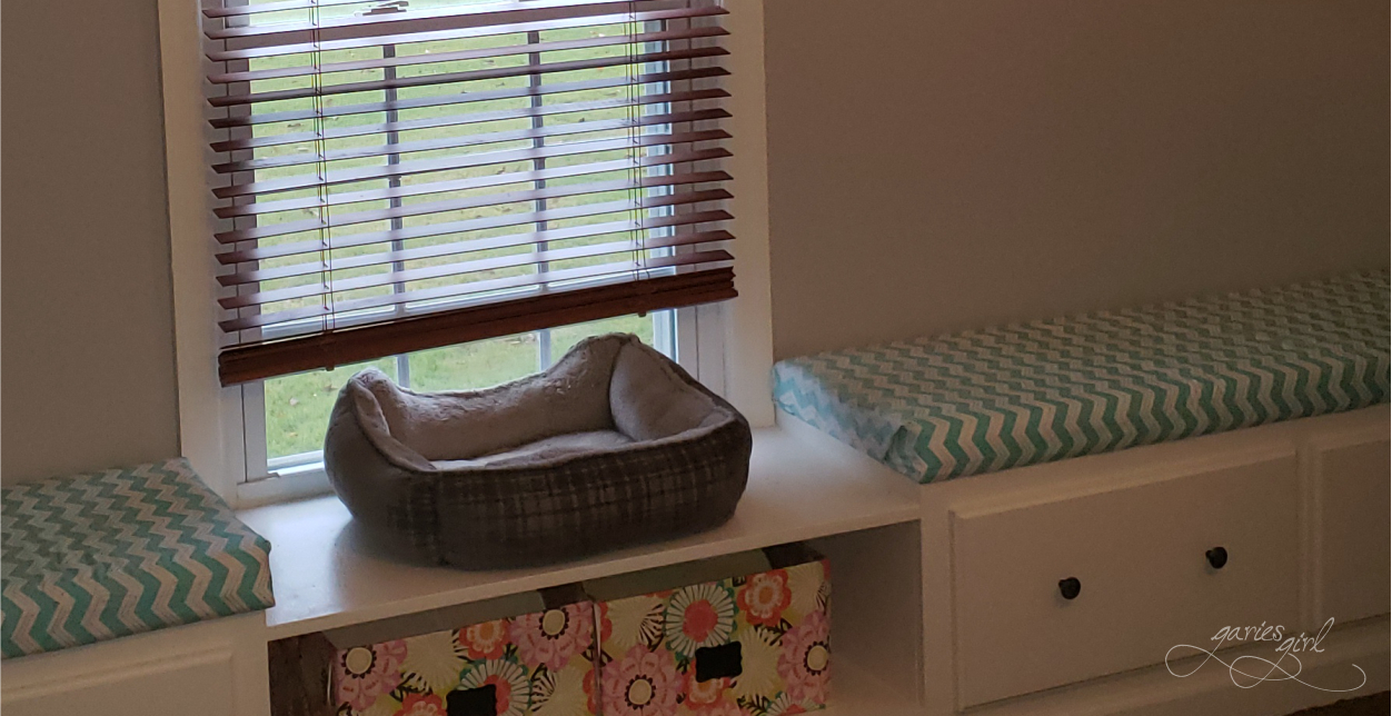 Still, in my office, my built-in benches had pink cushions when we bought the house. Here, I removed the old fabric from the bench cushions and recovered them with the same fabric I used on my office cork boards.