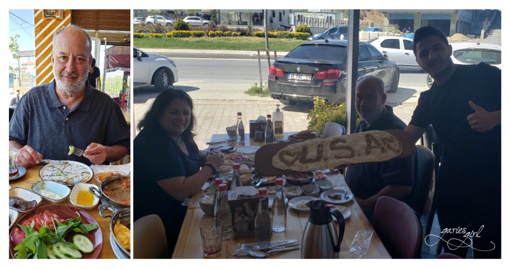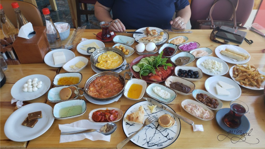 You might want to know what a classic Turkish breakfast is. Well, it is generally comprised of black and green olives, cucumbers, cured meats, dips and sauces, eggs, fresh cheeses, fresh tomatoes, fresh-baked bread, fruit preserves and jams, honey, pastries, and sweet butter. So this was what we were expecting. And boy, we were not disappointed! The staff just kept on bringing out more and more plates of food! The pictures say it all.