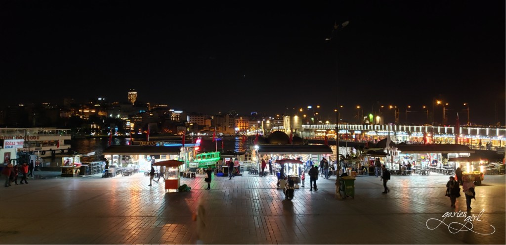 We were met with a fantastic view when we finally made it all the way down to the Golden Horn waterway (an inlet of the Bosphorus river). Our walking route ended at the Galata Bridge, which crosses the Golden Horn and we could see the ferries going back and forth. We could also see so many mosques in the distance. The current bridge is the fifth known as the Galata Bridge and was only completed in 1994. The first version was constructed back in 1845. The bridge’s top deck has car lanes and a pedestrian walkway in each direction. Below, on the first floor, is a market area with many different restaurants.