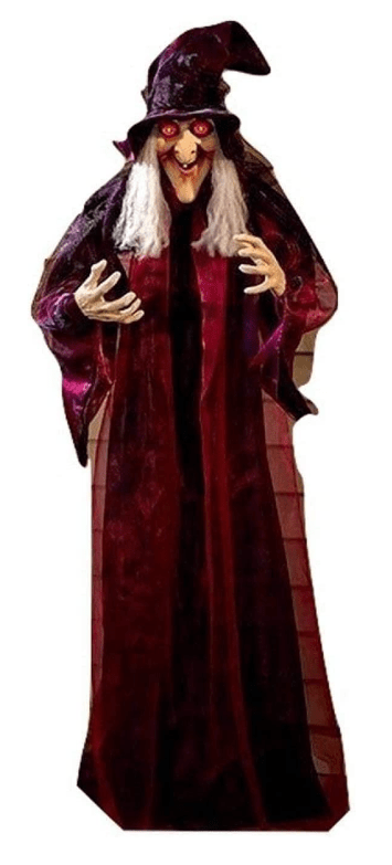 Another life-size hanging decoration, this time of an animated witch. A bit more pricey at $37.00 but so much more detail in the piece. Not only does she move, but she has different phrases to scare your visitors. Do you also think she is pretty?
