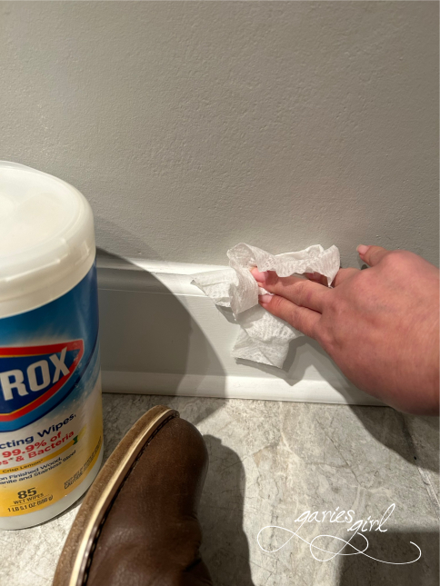 The Mr Clean Magic Eraser comes in handy when cleaning walls near light switches and door handles. Places where dirty hands might have touched multiple times and left their mark. It also makes scuff marks disappear with minimal effort. I use disinfecting wipes on all door handles, cabinet pulls and light switches.