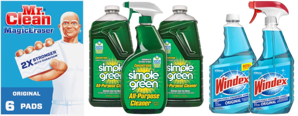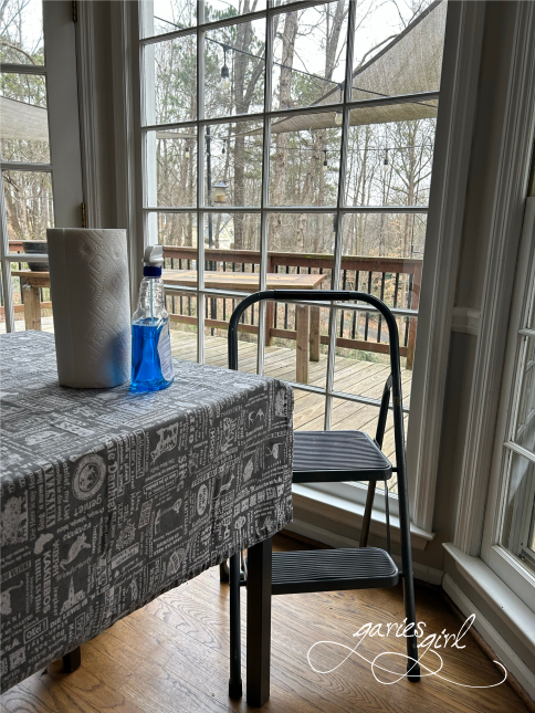 Let’s face it – nobody can clean a house with just a rag. You need multiple cleaning tools. My tools include a duster with an extendable handle, a reusable rag, disinfecting wipes, a Mr Clean Magic Eraser, and since I’m vertically challenged, my step ladder. As for cleaning products, I use Simply Green for most surfaces and Windex for cleaning my windows. I also use furniture polish for wooden furniture, paper towels and dryer sheets.